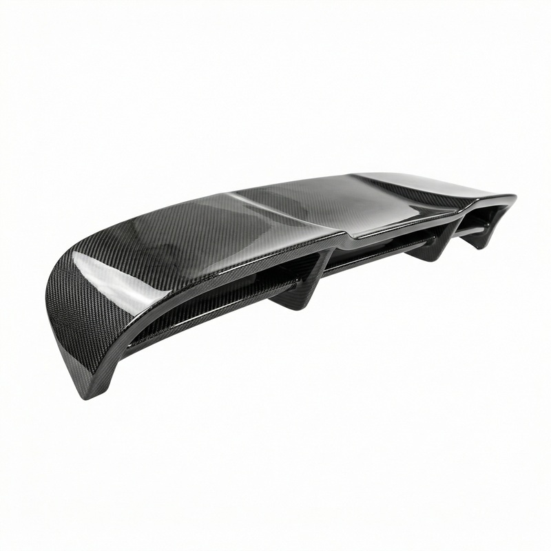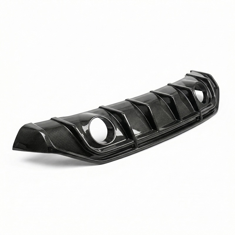 Difusor trasero con cortes para escape cuádruple, optimizando la aerodinámica.