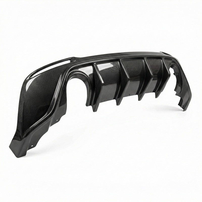 Difusor trasero con cortes para escape, mejorando la aerodinámica y el flujo de aire.